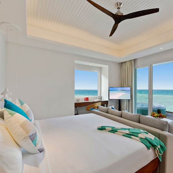 Every villa has its own vibe! Our Water Villas float over the turquoise lagoon with epic ocean and sunset views, meanwhile the Beach Villas give you direct access to our pristine white sands which is perfect for beach lovers. Our Family Sky Suites & other villas are spacious, stylish, and made for groups or families. No matter which you pick, every stay comes with that playful, stylish Kandima touch!